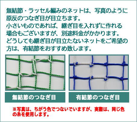 材 質 ポリエチレン 編網方法 無結節 網 目 25ミリ 本 数 36本 細い糸36本が撚り合わさり1本の網糸になります。 糸の太さ 2.1ミリ 色 グリーンネット周囲には、ポリエチレンロープが縫付けてあります。(※5ミリまたは6ミリロープを使用します。) 加工方法などネットに関しては ネットについてをご覧下さい。 別注寸法での製作をご希望の場合は、ゴルフ目別注防球ネット ・ 野球目別注防球ネット ・ サッカー・バレー目別注防球ネット をご覧下さい。カラーも豊富に取り揃えております。 (※よく「規格サイズの方がお得なのか。」とのご質問を頂きますが、規格サイズネットも別注ネットも同じ平米単価です。規格サイズのほうがお安いということはありません。) また、防鳥用(鳩避け/雀避け)ネット、装飾用ネット、盗難防止用ネットなどにご興味の方は、 多目的ネット をご覧下さい。
