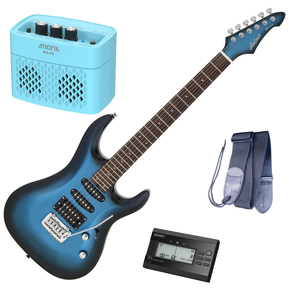 [MAC-STD MBS] MACシリーズのスタンダードモデル。 2点支持のトレモロユニットによる滑らかなアーミングも魅力です。 ネックを外さずにネック調整が可能なホイールナットを採用しています。 Body:Basswood, Carved Top Neck:Maple, Bolt-On Fingerboard:Rosewood Frets:24F Scale:648mm Pickups:AST-1 Single Coil x 2, APH-1 Humbucking x 1 Controls:1 Volume, 1 Tone, 5-way PU selector SW Bridge:ASB-1 Tremolo Hardware:Chrome Finish:MBS(Metallic Blue Shade) [SAT10B] 文字がくっきり見やすいハイコントラスト液晶を採用した、ギター・ベース専用の高精度チューナー。 2色のカラーバリエーションを揃えて新登場です。 ・ハイコントラスト液晶を採用 従来モデルに比べて視認性が格段にアップしました。 ・インプット・アウトプットジャック搭載 本番前にすばやくチューニングが可能なインプット・アウトプットジャック付き。 ・便利なフラット/シャープチューニング機能 ギターチューナーの定番機能フラットチューニングに加え、SEIKO独自のシャープチューニング機能を搭載。カポタスト使用時などに便利です。 ・電池寿命 約145時間(マンガン電池使用時)/約300時間(アルカリ電池使用時) ・音のズレを数値で確認できる「デジタルセント表示?」で、より正確なチューニングが可能です。 サイズ:105(W)×64(H)×16(D)mm 90g(単4電池×2含む) モード:オート・マニュアル・サウンド 入力方式:内蔵マイク、ライン 測定範囲:ギター<7B, 6E, 5A, 4D, 3G, 2B, 1E> ベース<Low B, 4E, 3A, 2D, 1G, High C> 基準音発振:ギター<7B, 6E, 5A, 4D, 3G, 2B, 1E>(1オクターブ上) ベース<Low B, 4E, 3A, 2D, 1G, High C>(2オクターブ上) 基準ピッチ:A4=435〜446Hz (1Hz刻み) 端 子:インプット・アウトプット 色:ブラック [ストラップ] ■幅:約48mm ■最短:約980mm ■最長:約1800mm [AG-05 BL] Bluetooth 搭載のポータブルギターアンプ。 電源はUSB C-type の充電式で、3時間充電の8 時間連続で利用出来ます。 勿論、充電しながらでも使用できます。 Bluetooth 対応なので、曲をかけながら一緒に演奏も出来、練習にピッタリです。 アンプですがスピーカーとしても使え、多くの用途としてお使い頂けます!! 色:ブルー [入門DVD] 収録コンテンツ ■ギターはこんな楽器 ■ギターの構え方 ■音符を知ろう! ■ドレミを弾こう! ■コードを弾こう! ■リズムを弾こう! ■アルペジオで弾こう! ■左手のテクニック ■ギターソロに挑戦!